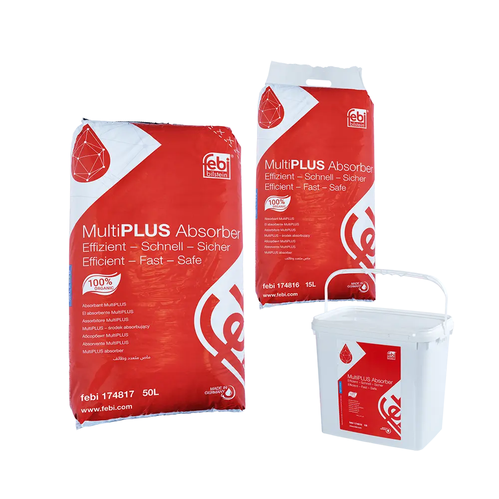 febi MultiPLUS Apsorber nudi inovativno rešenje za sva preduzeća koja rade sa tečnostima; naš apsorber stavlja tačku na zamrljane podove u radionicama i na nezadovoljavajuću upotrebu tipičnih sredstava za vezivanje ulja. Može da upije sve vrste prolivenih tečnosti: ulje, gorivo, maziva, emulzije, kočne tečnosti, rashladne tečnosti, antifriz, hemikalije, farbu i još mnogo toga.